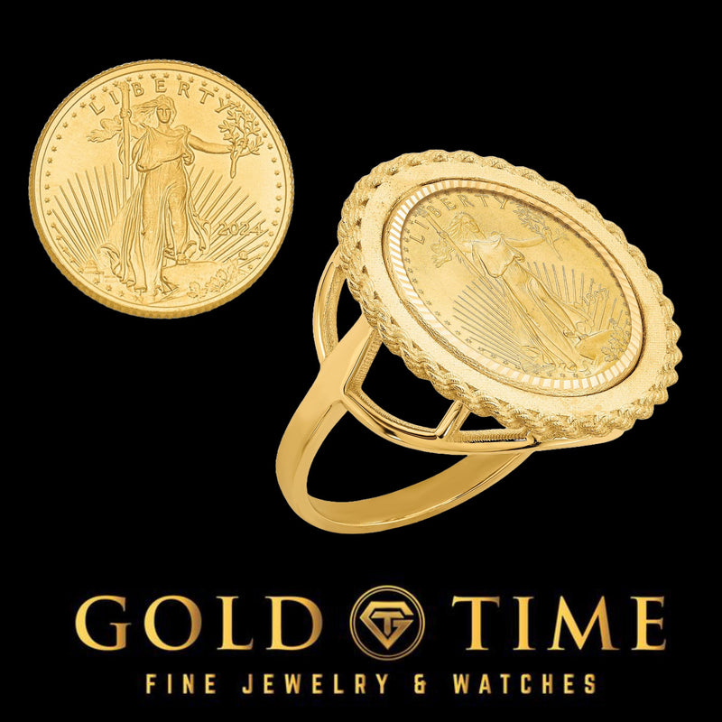 Women's 10K or 14K Gold Rope Edge Coin Ring 1/10 oz American Eagle Coin