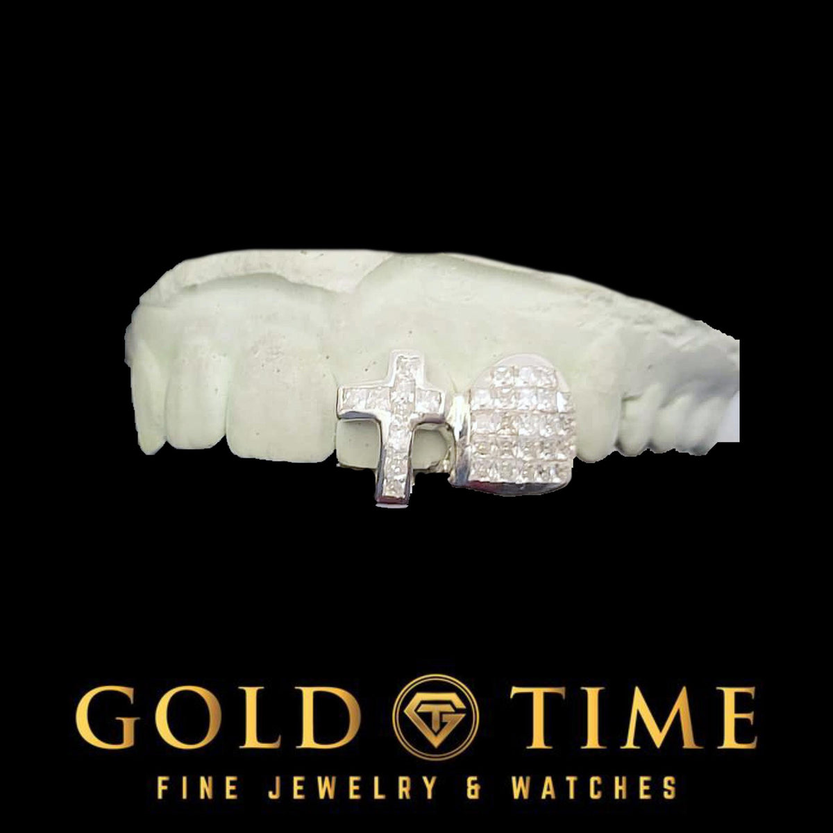 Crafted by Gold Time, this custom two-tooth cap pairs a full invisible moissanite setting with a striking cross cut-out moissanite design. Choose silver, gold-plated or rose-plated silver, or solid 10k/14k yellow, white, or rose gold. Each set is made to order and finished to a high polish for head-turning shine and comfortable wear.