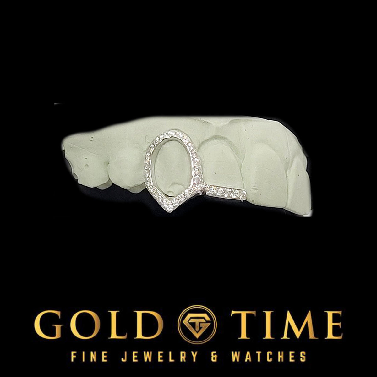 Handmade double-cap grillz featuring a moissanite open-face fang with a moissanite tip—precision fit from your exact mold.