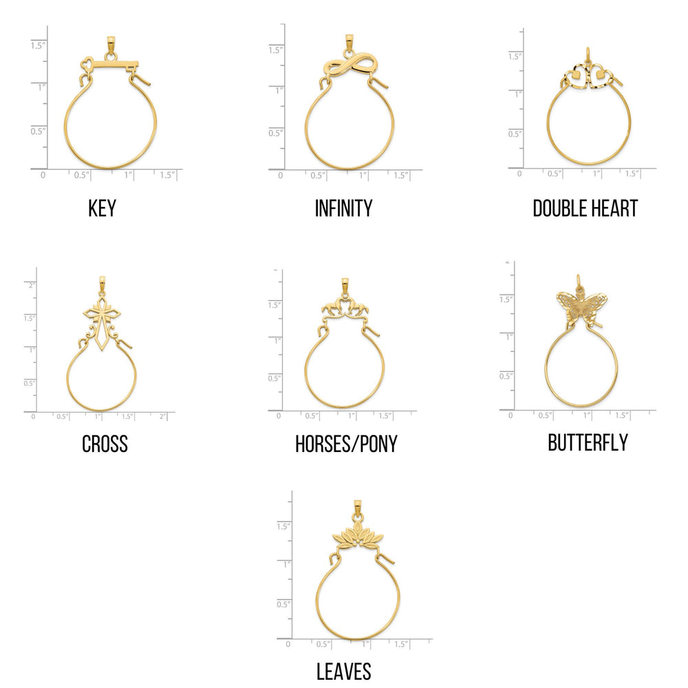 Showcase your favorite charms in style with our 14K Yellow Gold Charm Holder Pendants, available in a variety of beautiful, meaningful designs. Choose from motifs like double hearts, infinity symbols, heart-shaped keys, butterflies, crosses, horses, or a graceful leaf—each handcrafted in solid 14K gold for a timeless, high-quality finish.