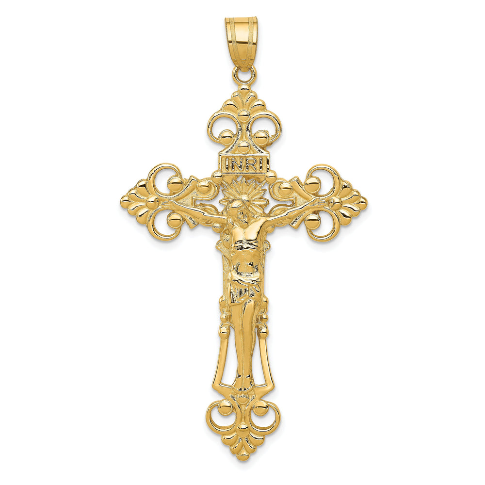 14k Gold INRI Crucifix Pendant for Men & Women Large Fleur de Lis Cross Charm Religious Gold Jewelry Gift Catholic Necklace Pendant