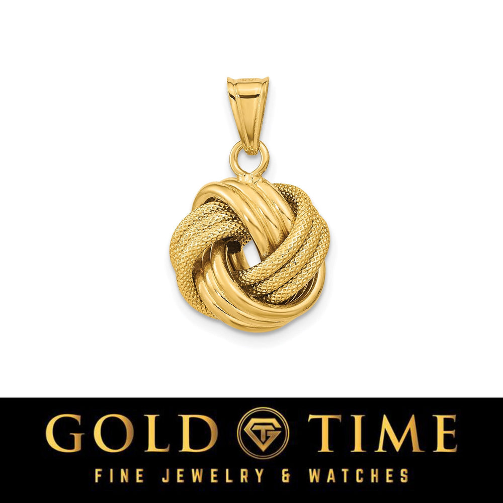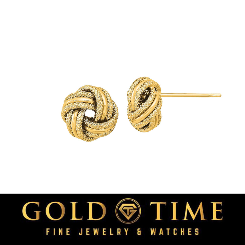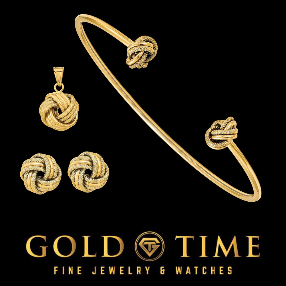 - 14k solid yellow gold love knot set with textured and polished finishes