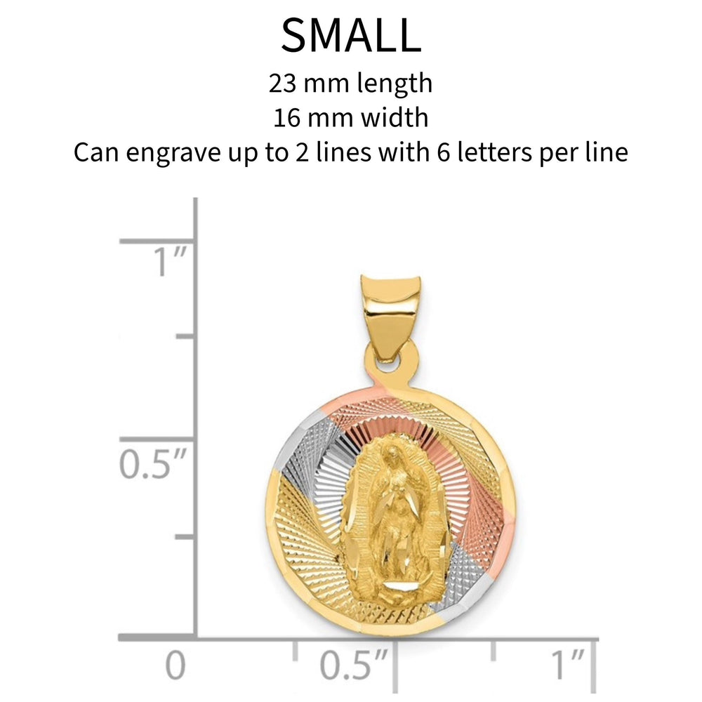 14K Tri-Color Gold Lady of Guadalupe Pendant Religious Medal in Yellow, White, Rose Gold - Solid Gold - Custom Engraving Options, 4 sizes