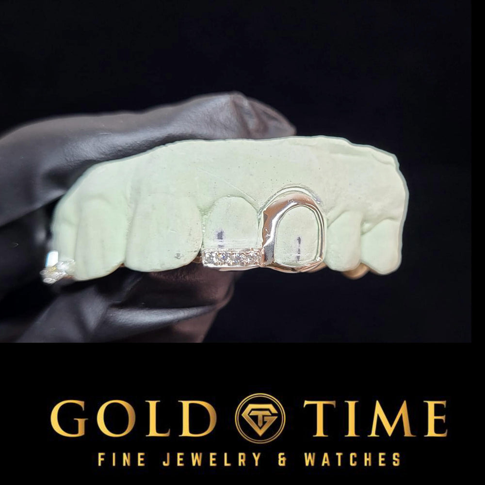 Custom 4 Piece Moissanite Tip Open Face Grillz: Silver, 10K, 14K Gold - Includes Impression Kit