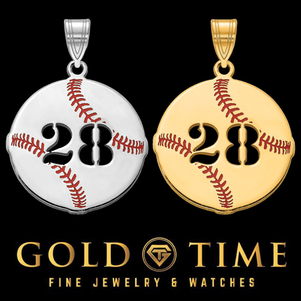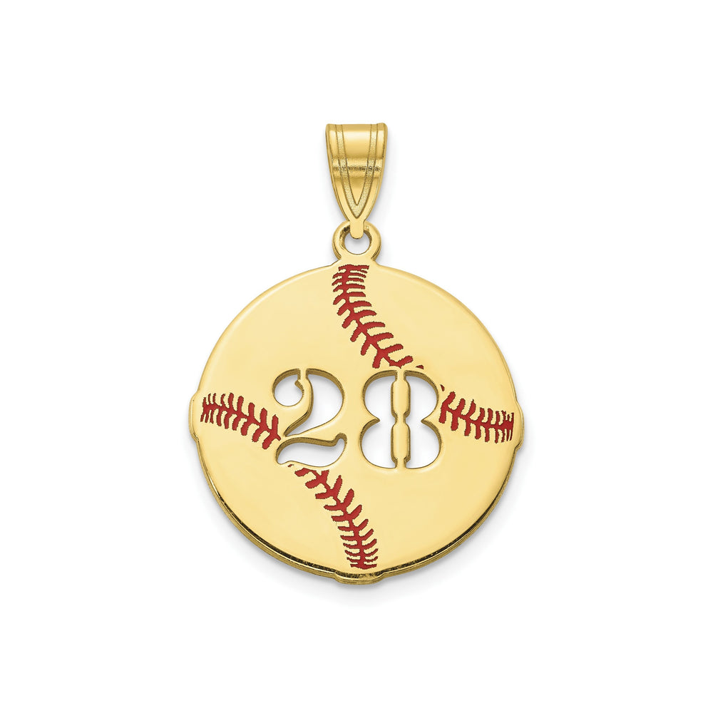 Celebrate your passion for baseball with this custom baseball pendant, featuring a unique cutout design for your jersey number and detailed red enamel stitching for an authentic look. Available in sterling silver, gold-plated silver, 10k yellow or white gold, and 14k yellow or white gold, this pendant is crafted to order for a truly personalized piece. Measuring 22 mm in length and 19 mm in width, it’s the perfect size for fans and players alike. The polished finish enhances its shine, making it a standout piece that’s ideal for birthdays, holidays, or as a meaningful gift for athletes and sports enthusiasts. This pendant comes beautifully packaged in a gift box, ready to show your baseball pride.