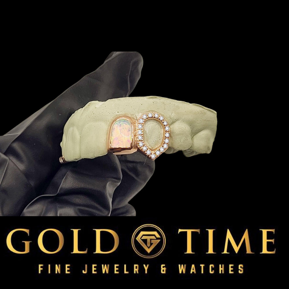 Make a bold statement with these Custom Double Cap Grillz featuring a dazzling synthetic opal incisor paired with a sleek open-face moissanite-studded fang design. Each grill is handcrafted with precision, ensuring luxury quality and a perfect fit using your unique dental impression. Choose from premium materials, including silver, gold-plated silver, 10k or 14k yellow, white, or rose gold to match your style. Our process begins with a free impression kit, followed by expert craftsmanship, resulting in a one-of-a-kind piece that reflects sophistication and individuality. Ideal for special events, music videos, parties, or to elevate your everyday style, these grillz stand out for their unmatched shine and personalized design. Trust in quality, precision, and luxury craftsmanship with every purchase.