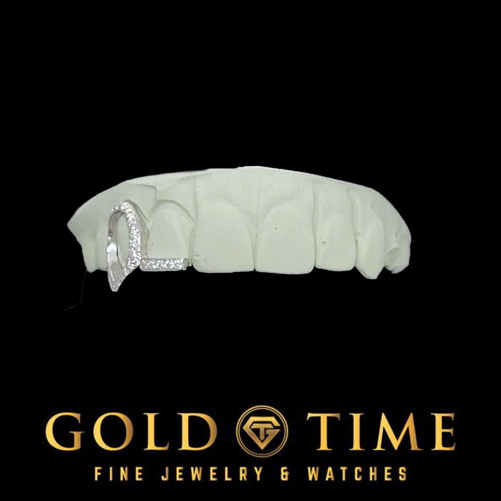 Handmade double-cap grillz featuring a moissanite open-face fang with a moissanite tip—precision fit from your exact mold.