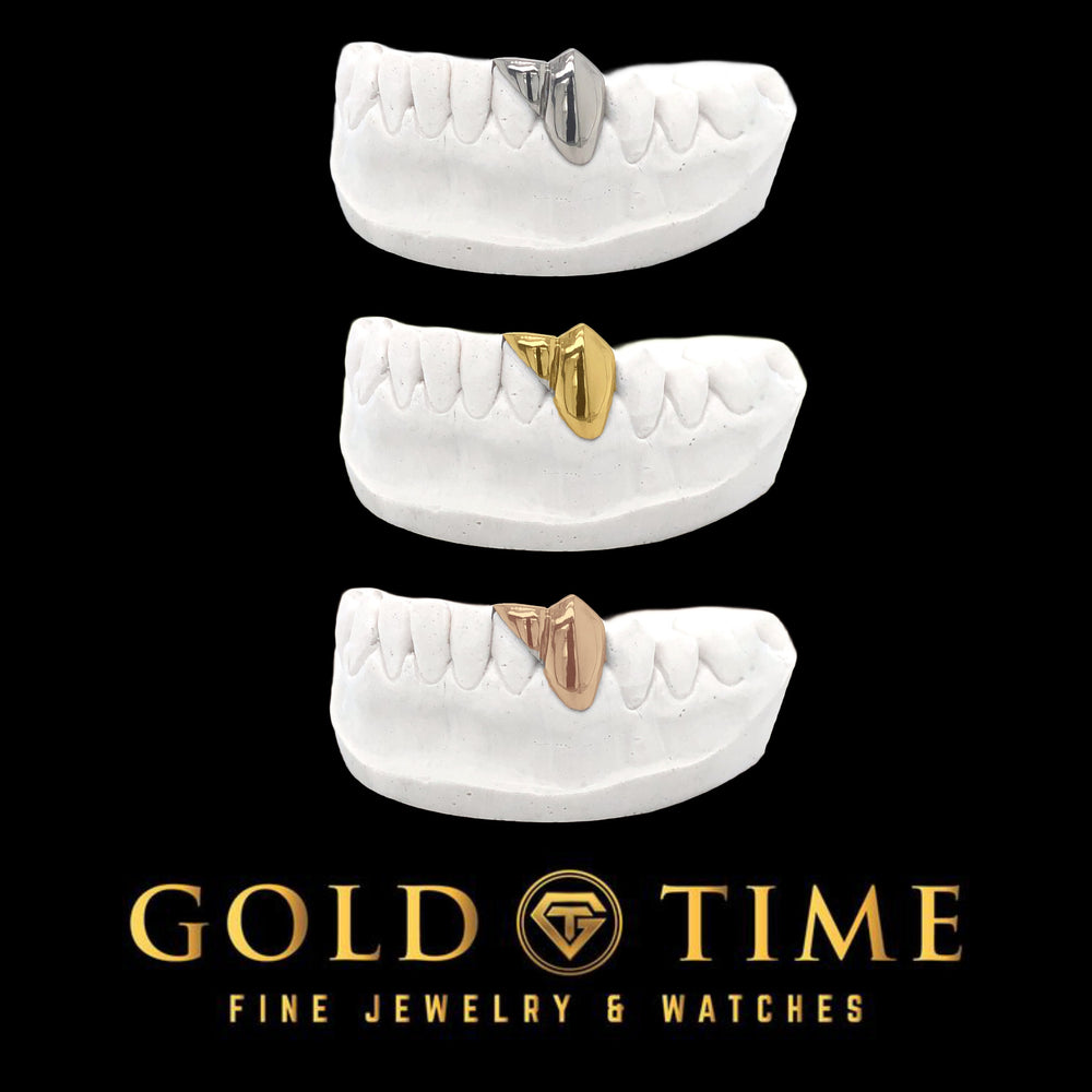 Take your smile to the next level with our custom 2-piece double cap grillz—featuring a diagonal incisor cap paired with a solid canine fang for a bold and distinctive look. Designed for those who want a unique, luxury statement, each grill is handmade to order with precision craftsmanship using your choice of gold, silver, or rose tones.