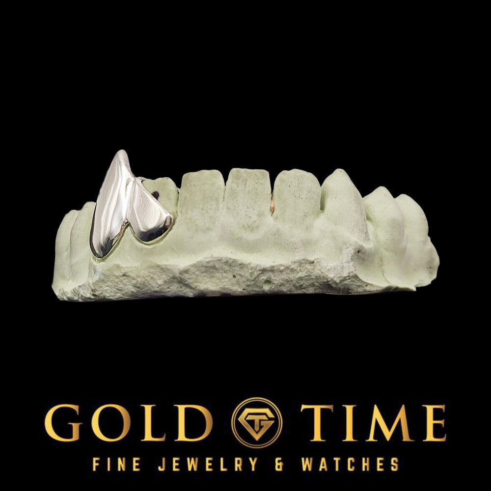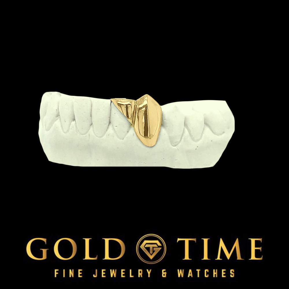 - Custom 2-piece grillz featuring a diagonal incisor cap and solid canine fang
