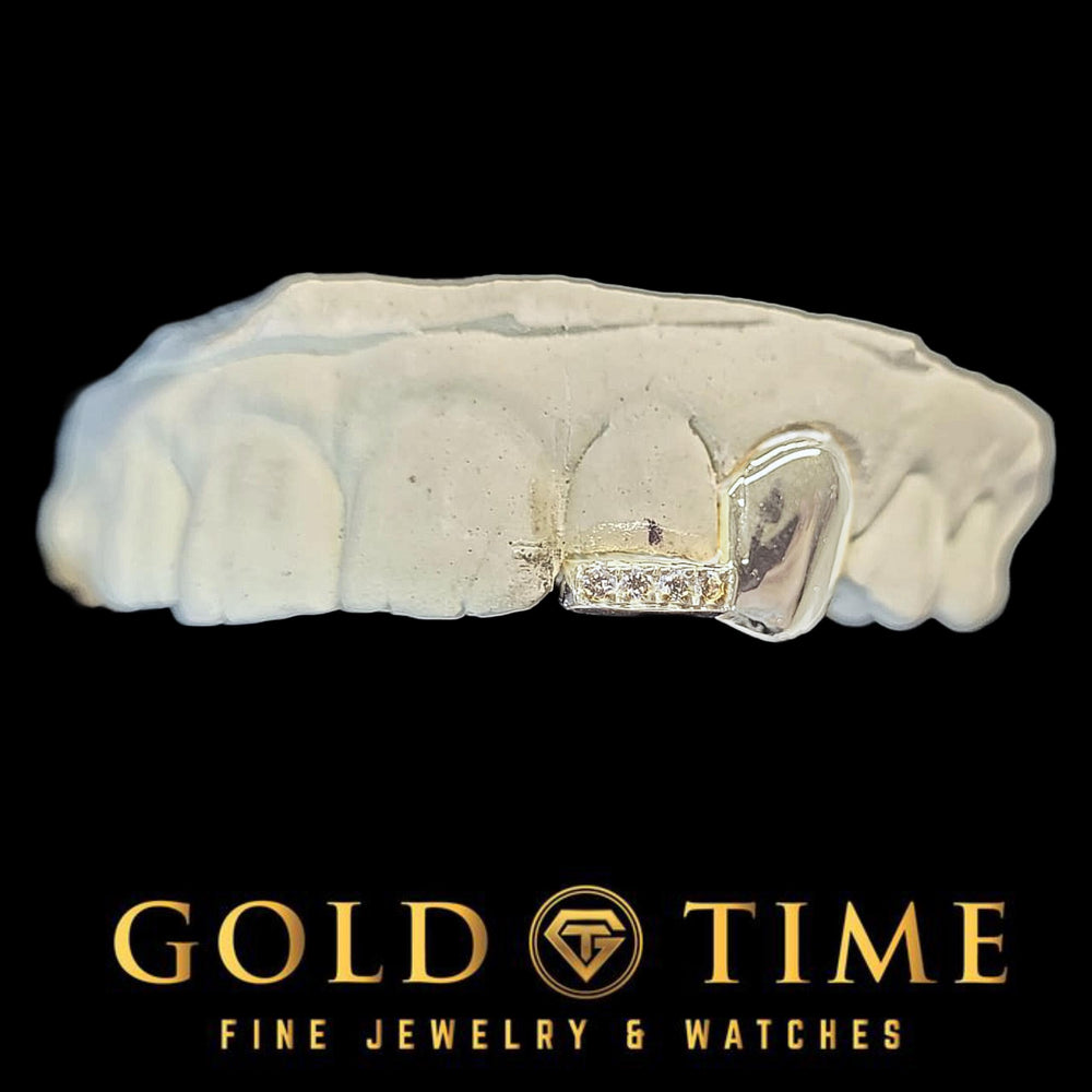 Bring edge and shine to your smile with this custom double cap grillz set, featuring a solid canine cap paired with a moissanite-tipped incisor. This design blends bold gold coverage with eye-catching sparkle, offering a clean and stylish upgrade to your grill game.
