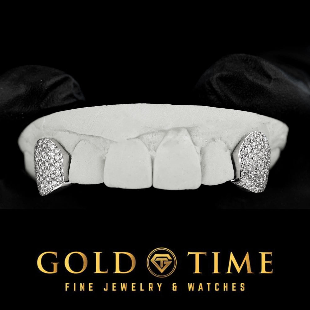 Turn heads with this bold and fully custom 2-piece bust down canine grillz set, featuring honeycomb pavé detail and a secure back bar connecting both sides. Each piece is hand-crafted to order using your dental impressions, ensuring a fit that’s as precise as it is stylish.