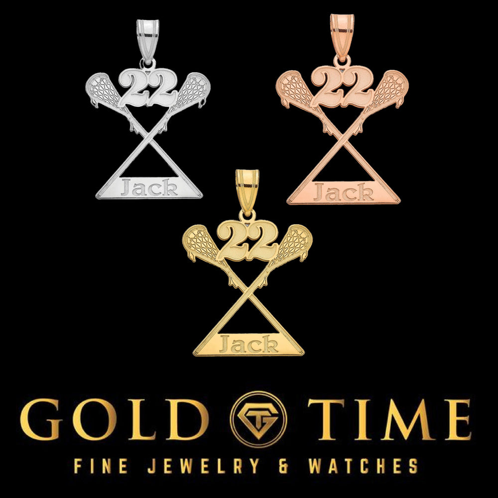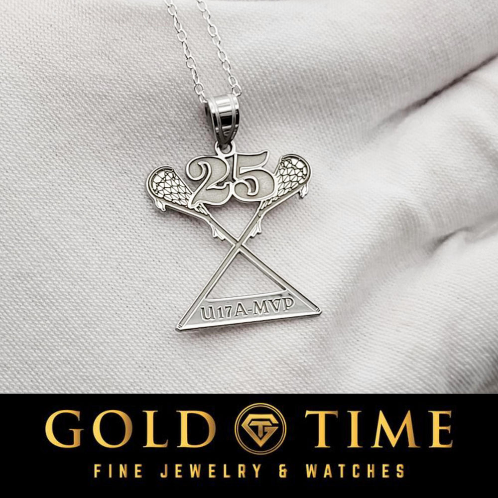 Celebrate your favorite player or honor your own journey on the field with this custom lacrosse pendant, engraved with your name and jersey number. Featuring two detailed lacrosse sticks crossed beneath bold digits and a custom nameplate, this polished piece is the perfect way to wear your passion proudly.
