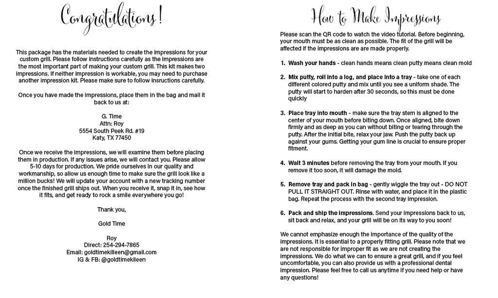 Get the perfect fit for your custom grillz with our premium at-home impression kit — trusted by hundreds of customers who order from Gold Time Killeen. Whether you‘re designing your first set of grillz or sending a new mold for a fresh design, our DIY impression kit gives you fast, accurate results in the comfort of your home.