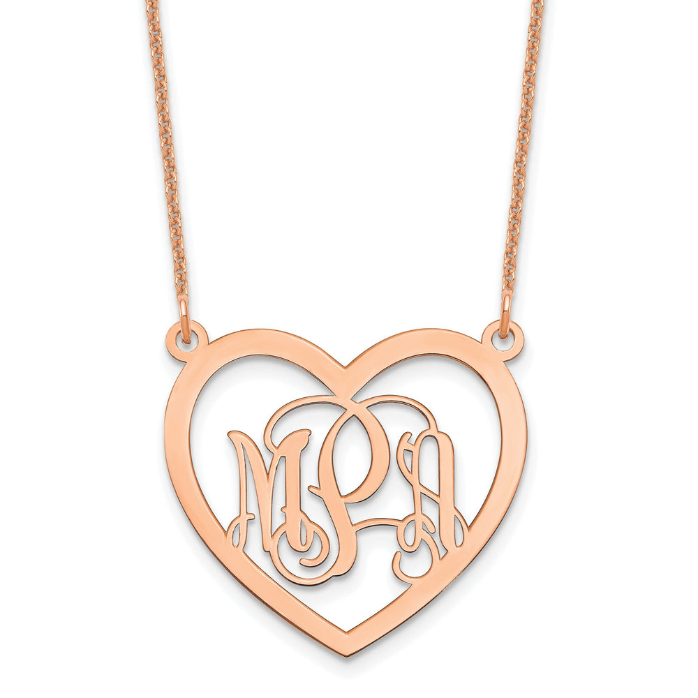 • Custom heart monogram pendant crafted in sterling silver, gold plated silver, rose plated silver, or solid 10k/14k gold
