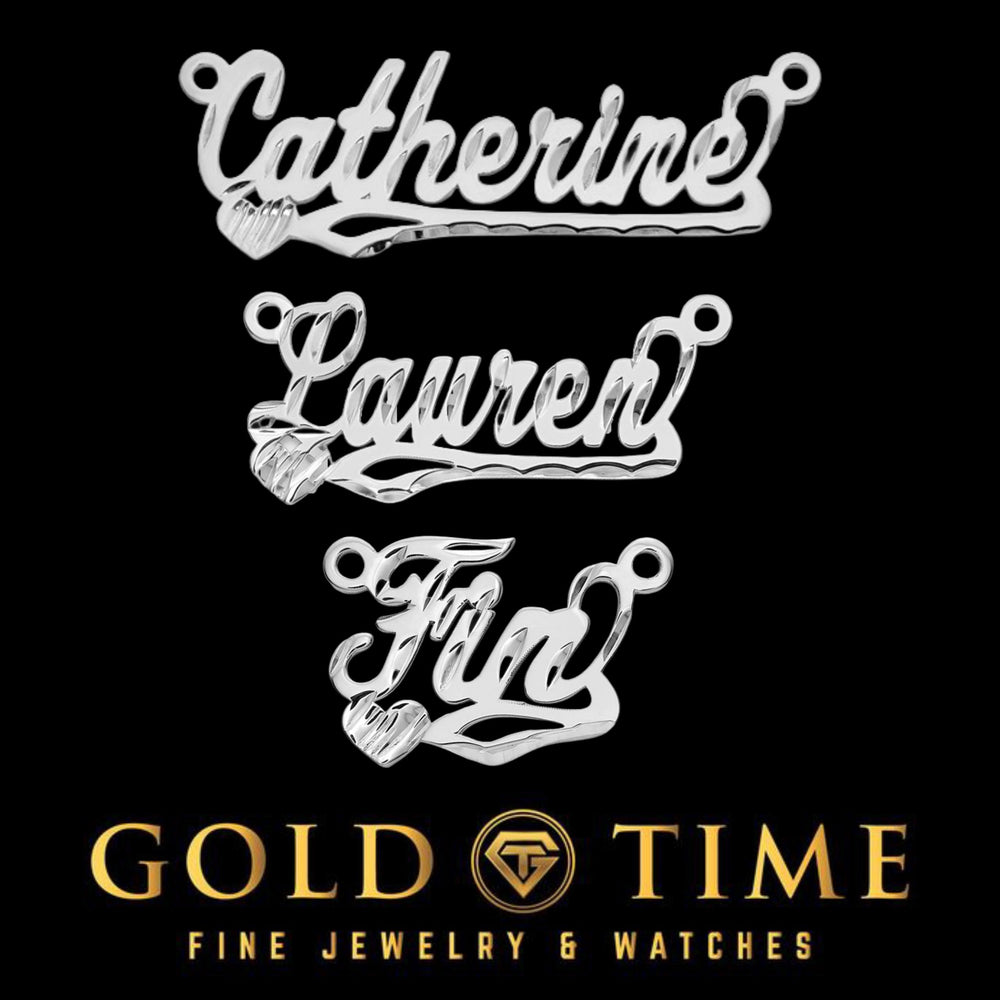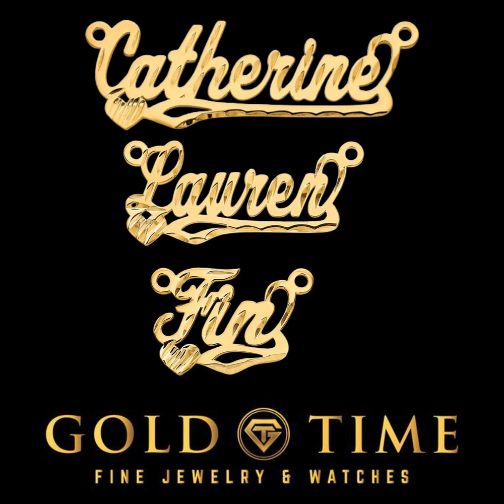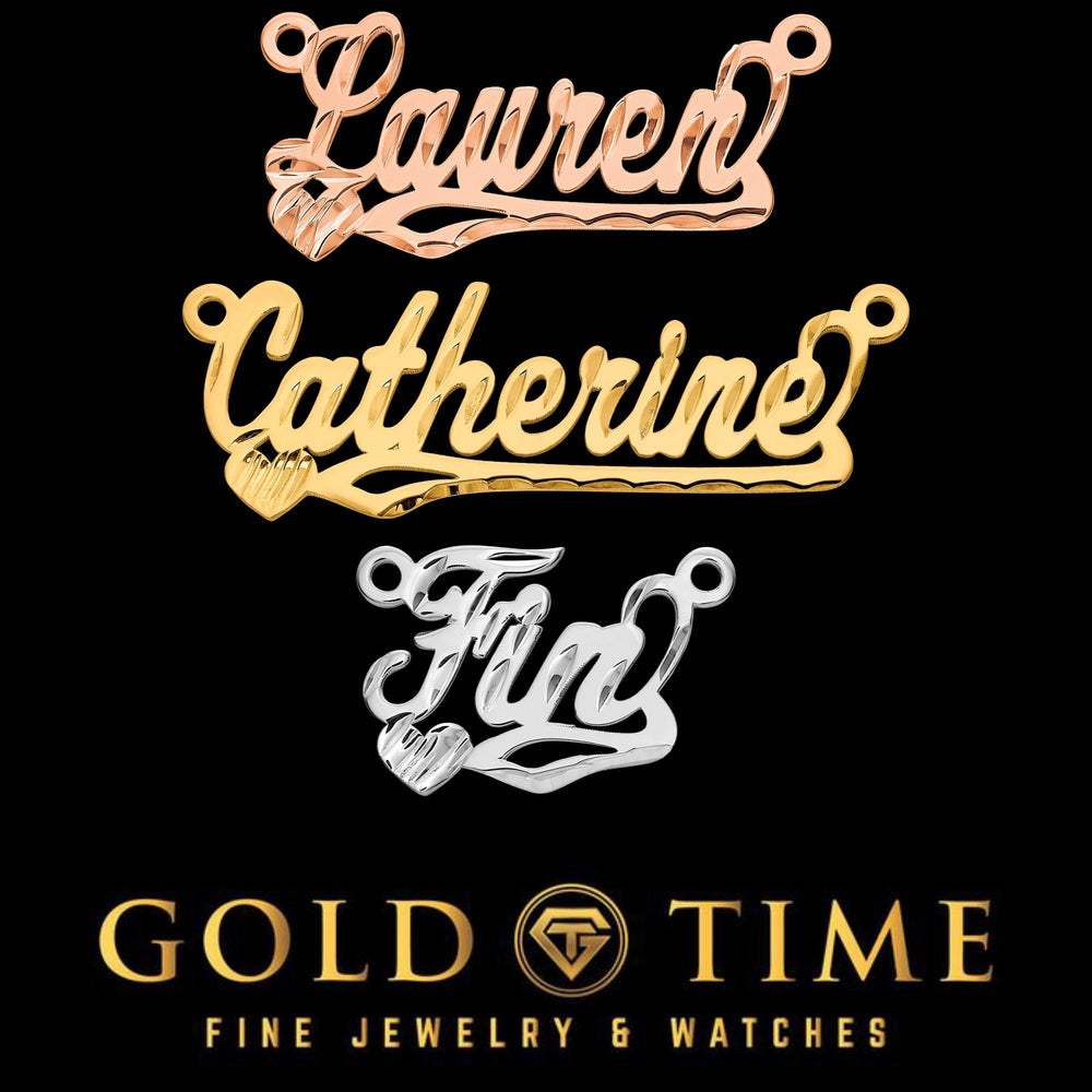 Celebrate your name or gift someone special with this handcrafted name plate pendant featuring a graceful diamond-cut script and delicate heart detail. Available in your choice of sterling silver, gold plated silver, rose plated silver, or luxurious 10K or 14K yellow, white, or rose gold, this piece is made to order and fully customizable. This design measures approximately 11 mm in length and 27 gauge thickness (.69 mm).