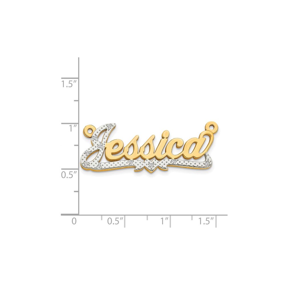 Celebrate your unique style with this custom gold name necklace, crafted in your choice of 10K or 14K two-tone gold and adorned with natural diamond accents. This made-to-order nameplate pendant features a polished finish and .04 CTW round diamonds, adding a subtle sparkle to your personalized jewelry piece. Whether you choose to wear your own name, a loved one‘s name, or a meaningful word, this pendant is a timeless statement of individuality.