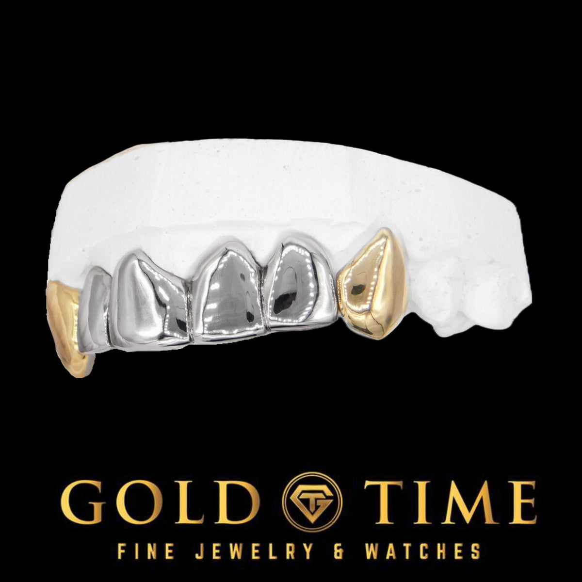 - 6-piece two-tone grillz with white gold or silver center and yellow gold canines