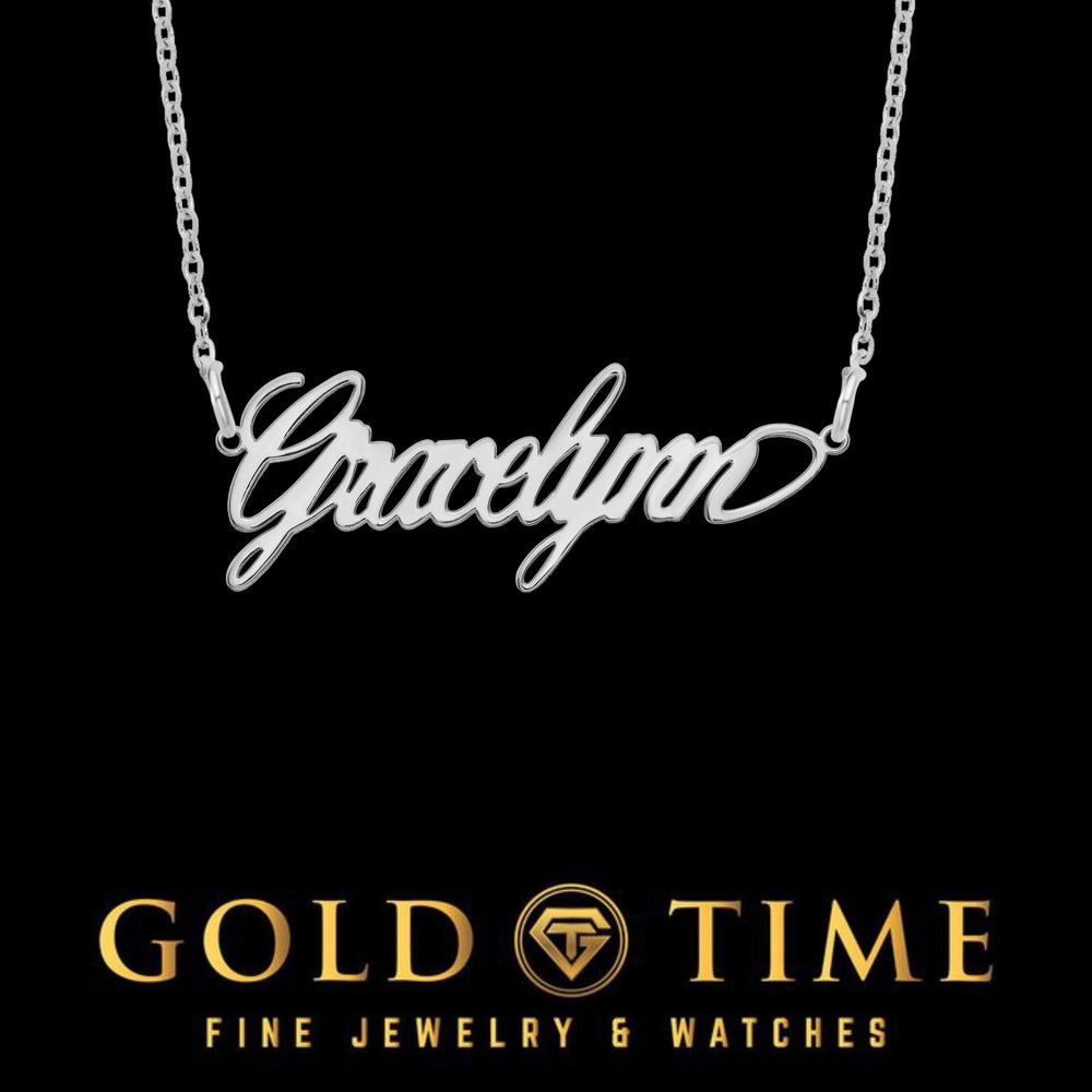 This stunning Velvet Flow Font Name Necklace features a graceful, flowing cursive design that brings your name—or a loved one’s—to life in timeless style. Whether it’s a gift or your daily signature piece, this custom nameplate is handcrafted just for you using precious metals and attention to every polished detail.